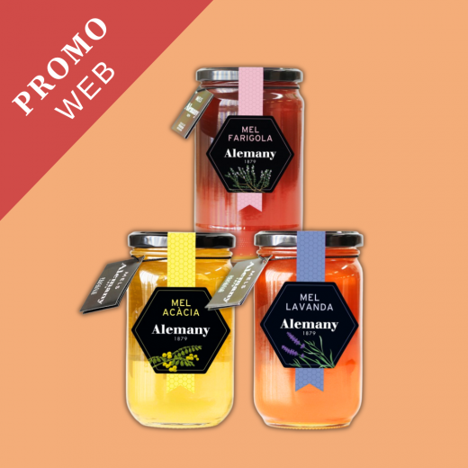 Conté 3 pots de mel de 500 g, de les varietats Lavanda, Farigola i Acàcia.