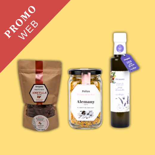 Pol·len 220 g, Ametlla recent torrada 200 g i Vinagre de poma ecològic amb mel de lavanda 250 ml.