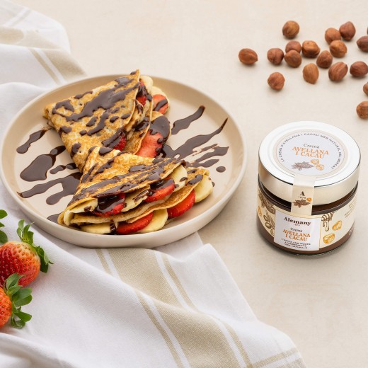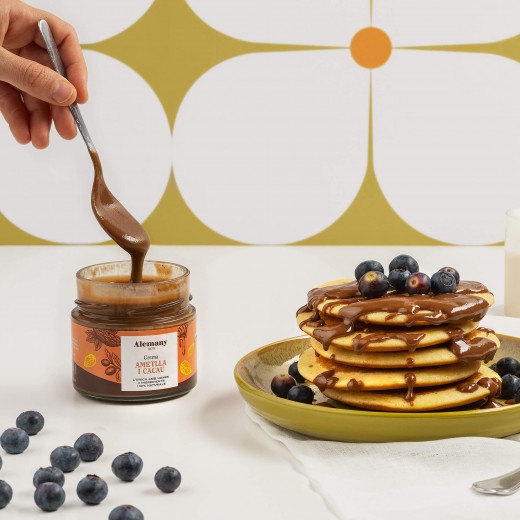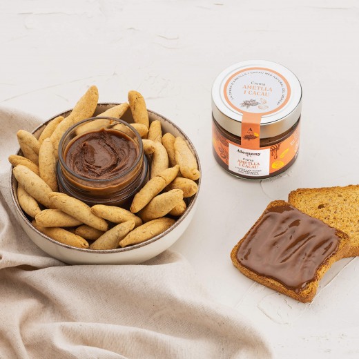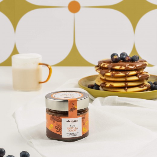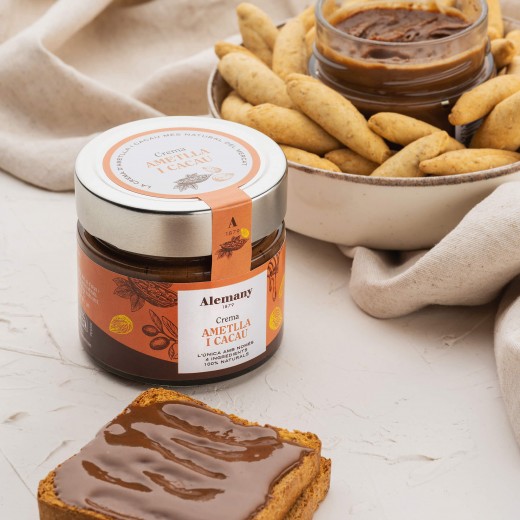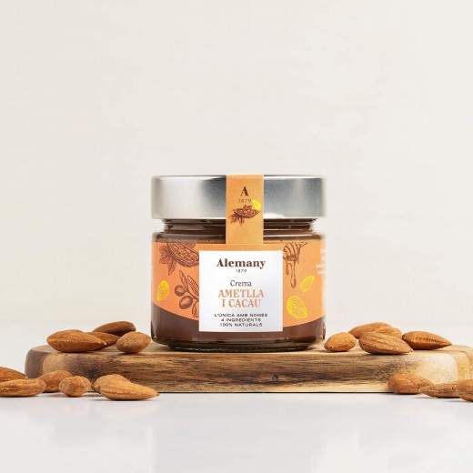 La crema de almendras y cacao Alemany es la clásica y tradicional crema para untar en su versión saludable, ya que está elaborada con solo 4 ingredientes nobles: almendras, cacao, miel y aceite de oliva.