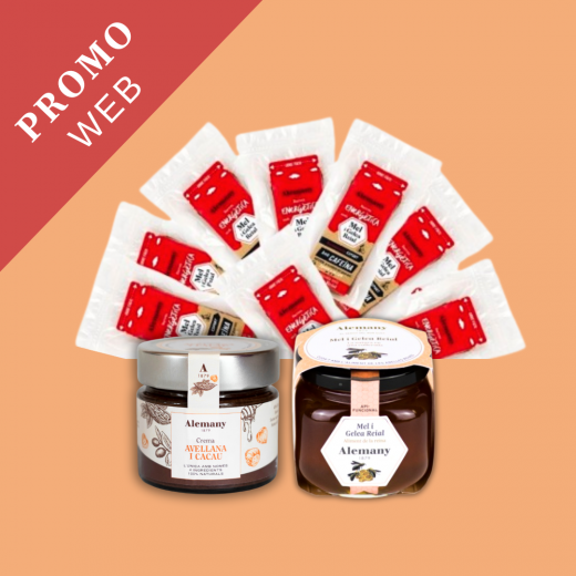 Contiene 10 barritas energéticas, Resistencia con cafeína, Crema de avellana y cacao de 200 g, y Miel con jalea real de 250 g.