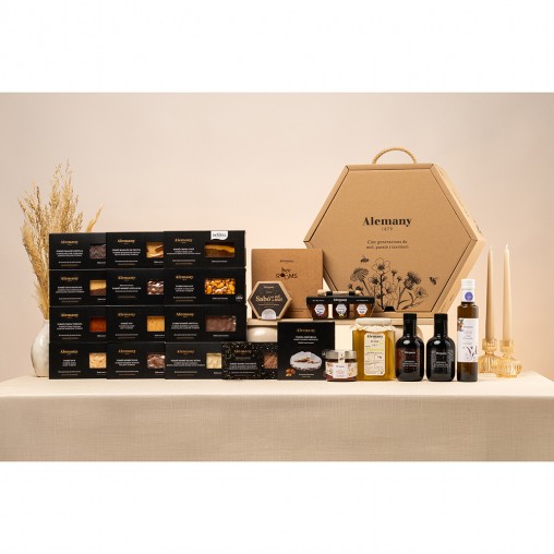- 13 variedades de nuestros mejores turrones artesanos: blando (⭐Great Taste), duro (⭐Great Taste), yema tostada (⭐Great Taste), crocante, bombón almendra, bombón avellana, bombón nueces, bombón músico, mazapán fruta, bombón crujiente, yema café, coco chocolate y praliné almendra.