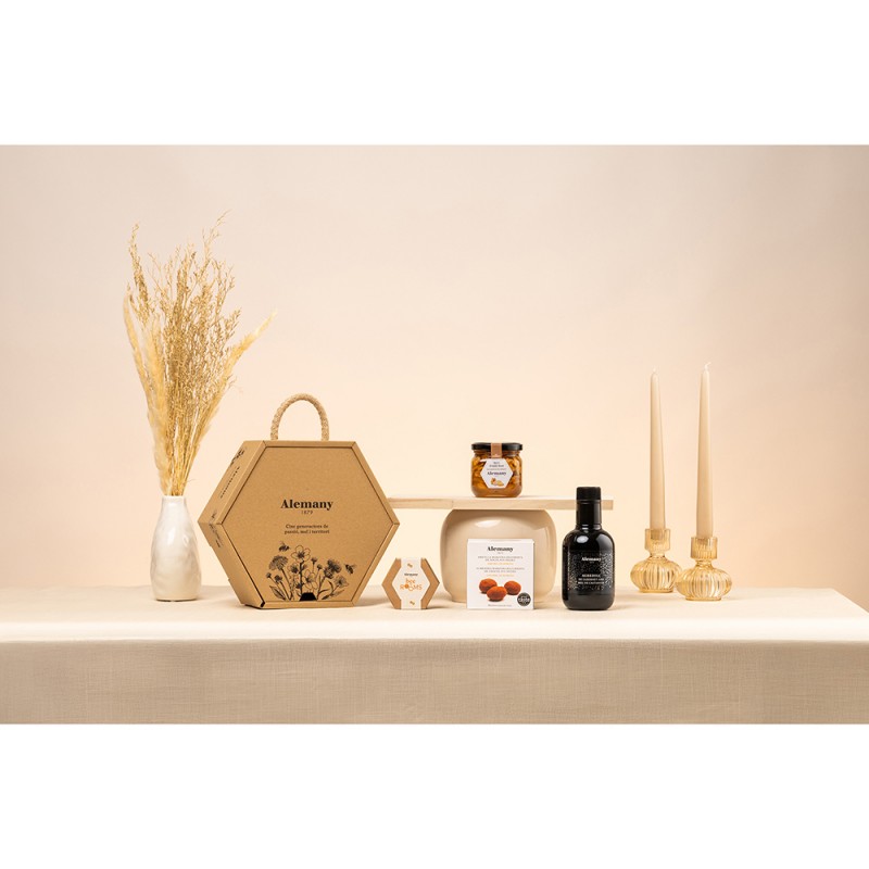 El lote llega dentro de la Caja Alemany, inspirada en las celdas de una colmena de abejas, un símbolo de nuestra experiencia y la profesionalidad de nuestros apicultores de confianza. Haciendo volar la imaginación, quien la recibe puede darle una segunda vida.
