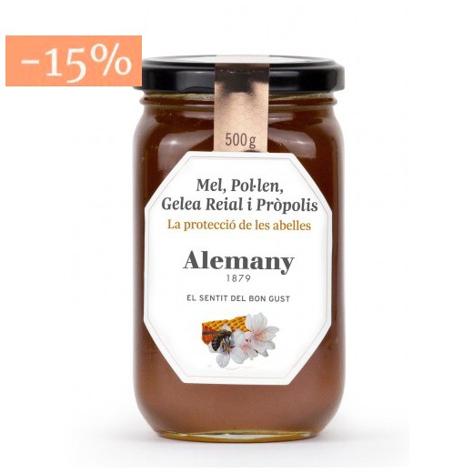 La Miel con polen, jalea real y propóleo Alemany es una miel bien completa y es la forma más sencilla de consumir todo lo que proporcionan las abejas en un mismo formato. La llamamos cóctel apícola haciendo referencia a la mezcla de los 4 productos apícolas que contiene y la mezcla de protección, energía, vitalidad y riqueza nutritiva que nos aporta.